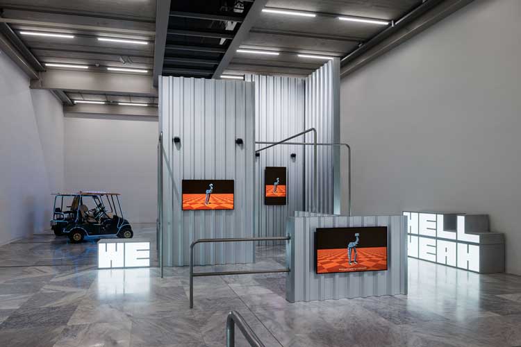 At MAK, Steyerl has presented a new work, Mechanical Kurds (2025), that continues these concerns. It is paired with 2016’s more visceral Hell Yeah We Fuck Die, providing a bridge between almost a decade of Steyerl’s practice. To enter the exhibition is to jump suddenly from one architectural milieu to another. MAK’s main courtyard is a warm-hued 19th-century palace, covered in neo-Renaissance decorative paintings. Steyerl’s exhibition is off to the side, in a white-walled room with exposed metal ceiling beams. The courtyard’s calm is replaced by pulsating techno. Phrenetic videos are mounted on sleek corrugated steel sheets. Illuminated letters are strewn across the floor, large enough to serve as benches. The biggest of these units reads “FUCK DIE”, the two words compounded into a single nihilistic curse.