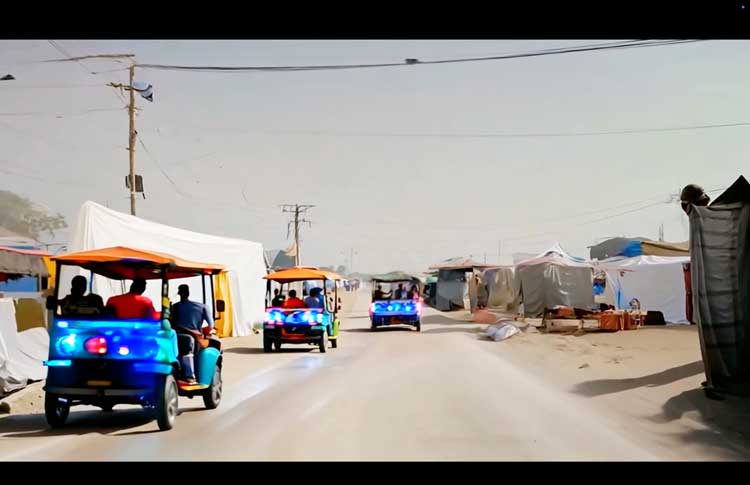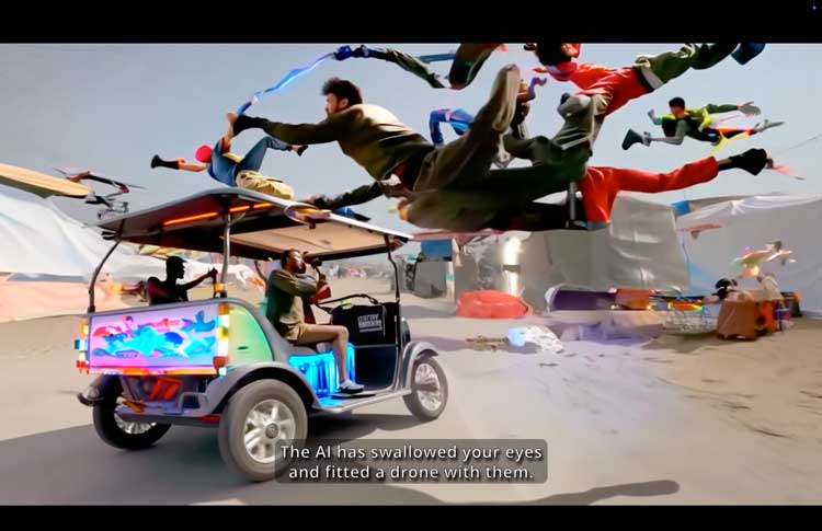 They also describe the streets they analysed, which they feel variously resemble the US, Switzerland, China and Germany. This is when things get strange. The film ends up in an AI-generated city square with an oversized streetlamp and what looks like a steampunk interpretation of Berlin’s TV Tower. Golf buggies – which also provide seating at MAK – spin around this square with reckless abandon. Then a drone appears. The vehicle explodes, and the film cuts to a Kurdish journalist describing a drone attack in which his two fellow passengers were killed. The tonal whiplash is immense and devastating.