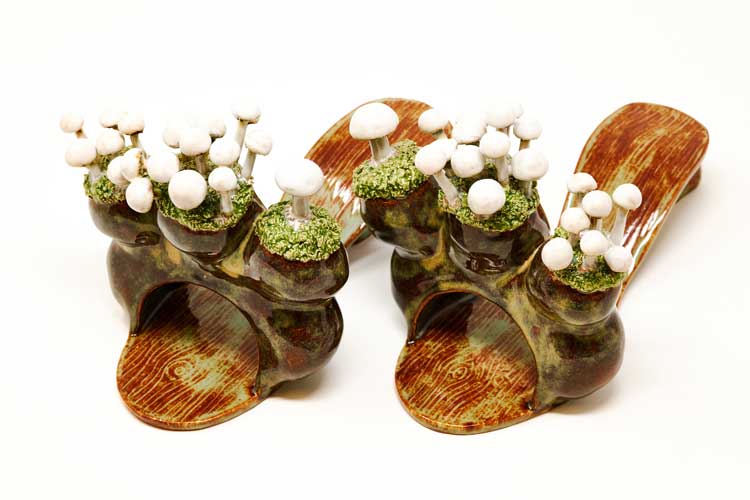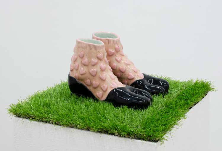 AMc: Tell me about the shoes. I know you have done a lot of research into the history of the ceramic shoe, from its origins in Persia in 2,000BC to its more surreal manifestations in the work of Meret Oppenheim and Yayoi Kusama. How has this history and fetishisation fed into your work?