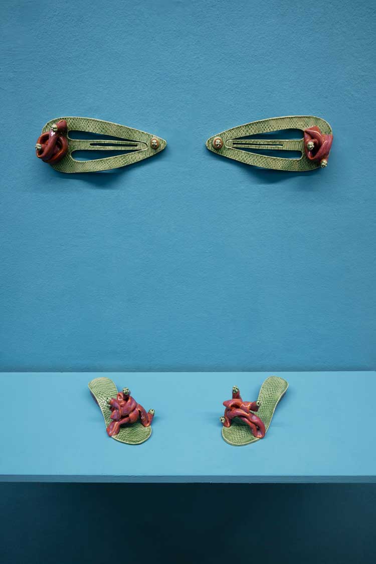HS: The curator, Joséphine-May Bailey, actually suggested that story, and at first I wasn’t very sure about it. I was thinking more along the lines of The Hearing Trumpet, because there’s so much in it, and it’s more figurative. The Debutante is a short story. I read it about three times, and then I thought: “No, this really encapsulates her.” She wrote it, apparently, in French, and when she was very young. To me, the story signals her rejection of the society that she came from, which is something that she returns to in her work over and over again. It’s definitely one of her drivers. The other driver, I think, is the fact that she believes animals are as important as humans and that somehow she could be substituted by a hyena. The more I read it, the more I found it captivating. The difference between us and animals is that we dress up, but, in this story, Carrington reverses it: it’s the animal dressing up as us. That’s very clever. And it’s that simplicity, with all those emotions poured into that reversal, that makes the story so visceral. They’re so obvious, they’re so present. I felt really inspired, so I decided to make my work, and then I went through the story again, and I titled everything with lines spoken by the characters. For example, when her mother comes to speak with her, and she’s really angry: “My mother came in, white with fury.” I had imagined what hairclips Medusa would wear, so I gave them that as a title. The Hyena has to learn to walk in heels, and I had made some tabi shoes with socks: “Turn around and see how pretty I am.” I found it really fun to make my work, but then play with her sentiment and see how that could be located within my work.