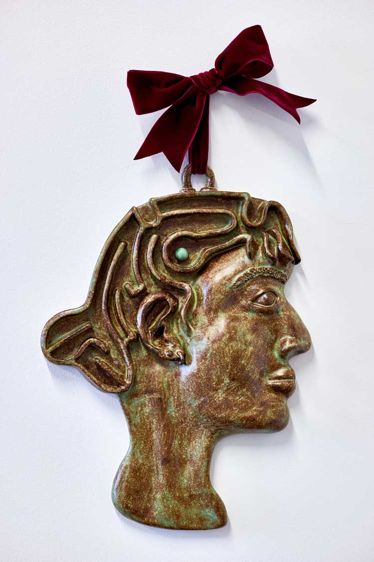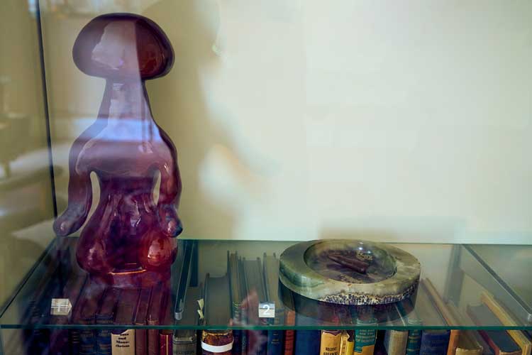 Holly Stevenson, The Witness, 2025, ceramic: glazed stoneware with Freud's favourite ashtray, the green oval dish; Museum reference number 3111. Installation view, Holly Stevenson, Tracing The Irretraceable, The Freud Museum, 2025.