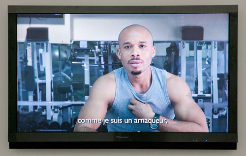 “The first question, when we started to work on the scams, was should we answer one of them and see what happens. But it wasn’t our place to do this. We found this ‘419 eater’, a forum trying to combat all the scammers – “419” is the name of the law in Nigeria which forbids the scams,” says Joreige. The work La Chambre des Trophées (2014) investigates the “419 eaters”, showing rolls of endless email correspondence from floor to ceiling and a trophy of the accumulating result, which often ends in a humiliating task for the scammer. “What is incredible is the idea that a scammer could be scammed by people,” Joreige continues. “If the scammer can be scammed, it has nothing to do with being conscious that there are scammers on the internet. It’s about the desire to believe that something can change your life: they are greedy, and they always hoped for something better.” The artists found themselves in a strange position when they discovered that Fidel, one of their non-professional actors, was previously a scammer himself. Hadjithomas tells me: “He said the text so well and then he told us he was a scammer. So what do you do? We couldn’t let this guy go. This is why we did the videos called It’s all Real (2014), because the scams could have been anecdotal, but we finally we got to the heart of something.”