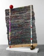 MF: Yes, now I make cardboard. The work that you see here is made out of this material. Before, the text was hidden in this jungle of cloud-like forms. Now, I am writing text or making drawings that are either highly personal or confidential in one way or another, and then I embed them in sheets of cardboard, which I then pile up in stacks. You cannot see the drawings or the messages, but I also cut them up into strips, so that bits and pieces of them become visible, but still illegible. There are two cardboard sculptures and two or three works made out of cardboard cutouts at the Robert Miller.