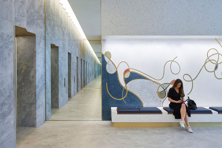 JP: Yes, it’s on the corner of Duke and Jermyn Street. It’s the first time I’ve worked within a set of set spatial and material conventions. That’s been interesting. There is a corner window made from carved Portland stone, which I have put gilding on, and I have created a gate made of patinated bronze. And there’s a big terrazzo drawing in the reception area. So, yes, it was really interesting.