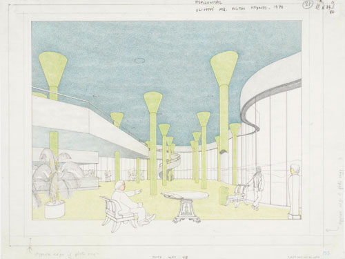 What the exhibition reveals is a penchant for drawing as a key means of expression, from the iconic Leicester University engineering building (1959–63), the Cambridge University History Faculty and Library which followed (1964–67) and the St Andrews University Melville Hall student residences (1964–68): drawing as a means of working out ideas – not simply in a process of enhancement – but of setting up oppositions, between possible solutions, steps towards the final version. This process was aided by Stirling’s own tendency towards self-quotation and re-quotation, essentially a literary kind of exercise. God was not in the details, as one great master from the pre-war period (self-referentially) was quoted to have said, but humanity certainly was for Stirling paramount. And in all three of the above earlier projects as built, Stirling and Wilford were pushing the frontiers of building technology, perhaps too often ahead of that in this country. St Andrews, Scotland was an innovative masterpiece of prefabricated concrete panel design (chosen because local brick building technology lagged behind): as a result the full scheme of eight “fingers” of accommodation was soundly costed with full benefits of scale but became inevitably uneconomic when reduced to just two by “economical” cost-cutting. The original Stirling proposal would have provided the university with all necessary room for student expansion for some decades to come, in a superbly appropriate landscape context. But it was not to be.