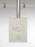 A major intervention to the gallery space is the removal of the double doors that usually separate it from the foyer, and their rehanging in the portal between the main and secondary gallery space. Here, they do not quite fit, and will not shut to. Crewe refers to them as an “improperly sealed feminine aperture”, always open and always available. This idea is also echoed by the hanging of an off-white soy wax tablet, depicting a bouquet of flowers in counter-relief, in the empty doorframe. This tablet is one of 28 and will be rotated daily throughout the exhibition. The references here are manifold: Jacques receives a daily bouquet of “immaculate white flowers” sent to his apartment by Raoule, which contrasts with the red bouquets that other mistresses would display in their lobbies to turn away suitors on the days when they were menstruating – Jacques, as a non-female body, does not have this excuse and must accordingly be permanently available, at Raoule’s beck and call, fully submissive. The 28 refers to the days of the female cycle, while the choice of soy is significant for its supposed anti-androgenic properties, blocking testosterone production.