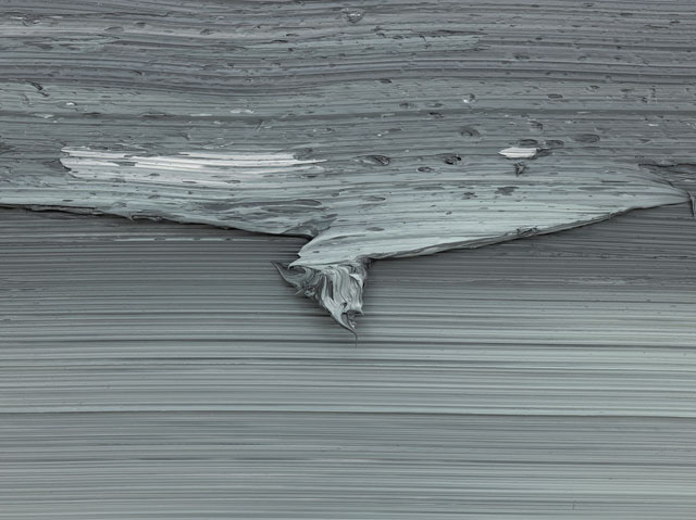 Entering Martin’s seventh exhibition with the Lisson Gallery, visitors are greeted by a set of five large, rather polite, portrait paintings sharing a common composition. Flat, monochrome backgrounds of blue-grey, white and black have been transected by vigorous horizontal brushstrokes running from edge to edge across aluminium and panel supports. These disturbances have introduced complexities of texture and colour, although, despite these interventions, the works remain restrained, their titles derived from the pigments used: Davy’s Grey, Titanium White, Raw Umber, Ivory Black.