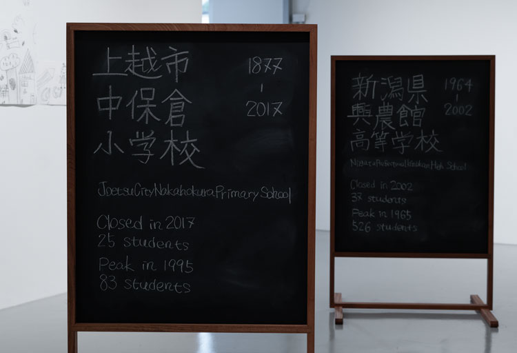 As if in another nod to pedagogical histories, it seems to me that Ichida’s collages also recall the photographs of Iwao Yamawaki, the Japanese photographer and architect who trained at the Bauhaus in Dessau. Yamawaki, like Ichida, began working in a commercial career (he in architecture, she in commercial photography) before undertaking further training and turning to art photography. On the back of the chalkboards are the shocking facts and figures of the decline and closure of each of the 10 schools presented by Ichida. The oldest, Nishidani primary school in the city of Nagaoka, which opened in 1872, closed on 31 March 2015 with eight students enrolled. At its peak in 1972, the student population was 103. One of the largest losses was seen in Minami Sabaishi primary school in the city of Kashiwazaki, which opened in 1921 and closed in 2011 with 30 students enrolled. At its peak, in 1947, the student population was 935, a shocking decline by any standards.