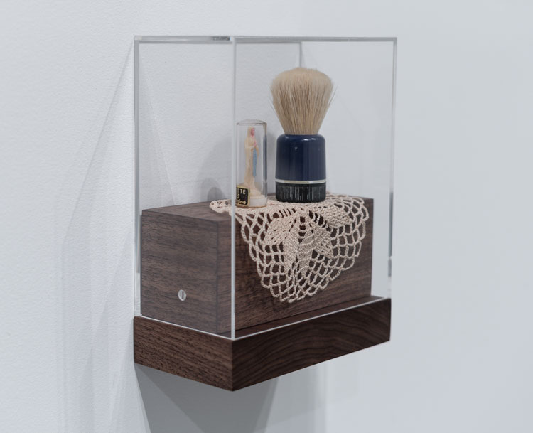 Alongside the photographs, a tiny Perspex box fixed to the wall at waist-height contains three small personal items: a shaving brush that belonged to the artist’s father and a lace place mat and a minuscule religious icon, a Madonna, that belonged to artist’s mother. Including these familial items in the exhibition extends further the sense of generosity in Manfredi’s work. In a short grainy Super 8 film shot in black and white, the viewer is welcomed into a site of celebration, a femminielli wedding that Manfredi was able to film at the end of the eight-month stay in Naples. This ritual is not about marriage but a rites-of-passage wedding performed to hand over the tradition on the femminielli from one generation to another. It is a true celebration and for Manfredi the perfect way to end this important period of research.