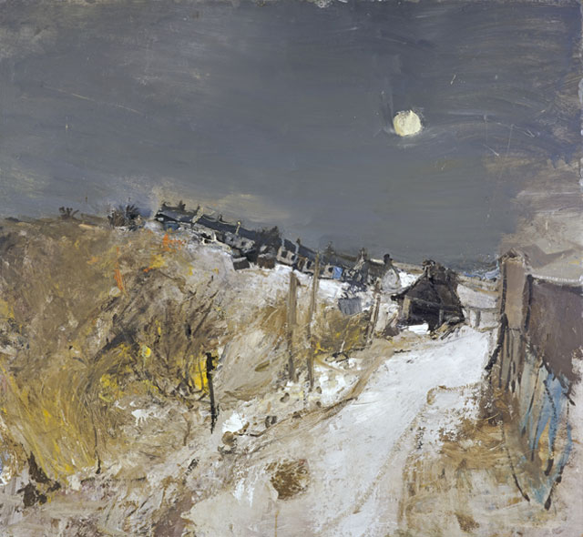 This focus on the cottages links her work in an interesting way – the tenements that Eardley had painted in looming colours, like cardboard cutouts, seem to haunt these rural cottages. Later, the landscape took precedence, taking over as a storm does. In Fields Under Snow (1958), the serene blues and greys of the background hills seem dissonant when torn apart by the mass of dark brown overgrowth in the centre of the painting. In Winter Day, Catterline (c1957-60), meanwhile, the row of cottages seems to be sliding into the sea, uprooted by the vivacious sunset and the dramatic, even chaotic earth. And yet a harmony exists in both images; a softness in the light and a resignation to the unpredictability of nature.