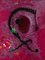This tracking between surface and depth is fundamental to the experience of these works, and is one reason why they read so differently – in a sense so inadequately – in reproduction. Seen closely there are a strange multitude of surfaces and depths, created as the opaque, matt, gloss metallic and translucent paints are interlayered and spattered over one another (The metallic, the matt thinned acrylic, and the plastic-like pure acrylic all read as successive levels of upper ground). In some, such as Throw the Dice, the depth even appears in the thick opaque patches themselves, as the impasto blobs are streaked with swirling lines of other colours that seem to draw the eye around and in yet again.