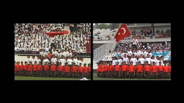 Köken Ergun: In 2005, I felt the need to record the annual 19 May celebration in Istanbul. Each city in Turkey used to stage its own celebration at a local stadium. High school students chosen from one school in that city produced these performances. Some of these schools were civilian and some were military. For this piece, I chose to focus on the performance of the military school in Istanbul. During my high school years, I was never selected to take part in these celebrations but, as civilian students, we were subject to patriotic poetry or marches, especially at the beginning or ending of the school week. I’ve always observed these scenes and found them too nationalistic and too macho. When I got older and was no longer a student, I looked back at it and “exorcised” my trauma of the republican education system by making a work about it. [The Turkish curator Vasıf Kortun used the term “exorcism” to describe Ergun’s work.]