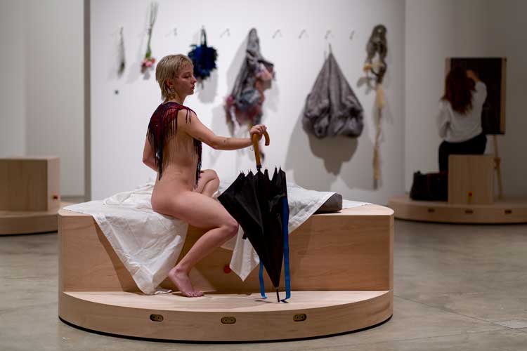 This freedom and irreverence are apparent in Lima’s works. Best known is Balé Literal, her ongoing series of installations: fabrics and objects that move through the space, hanging from a pulley, animated mechanically in an adjoining space so that the inanimate objects appear as if they are dancing. In The Drawing Drawing, her current exhibition at the ICA and her first solo show in the UK, there is a “dancing”, bright-red parasol in the upper galleries, but Lima also made a new, site-specific work. The titular installation occupying a large room in one of the lower galleries, The Drawing Drawing (2025), takes the form of a life drawing class, complete with a model, props and easels. Except that in Lima’s unique iteration, no one is teaching and everything is moving. The model is a professional, but the audience are invited as artists, both sitting on mechanised platforms, orbiting one another in unpredictable ways. When I visited Lima at the ICA, I tried it out myself, of course; as an art historian who doesn’t make art, the delightfully disorienting experience felt liberating.