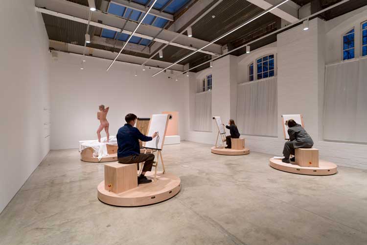 Laura Lima, The Drawing Drawing, 2026. Mechanised platforms (wood, metal, motors, electrical components, wheels), life model, paper, pencils and pens, still life display, ICA visitors. Installation view, Institute of Contemporary Arts, London. Photo: Anne Tetzlaff.
