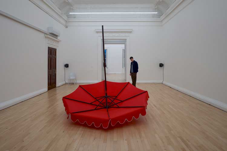 Laura Lima, Parasol Deux, 2023/2026. Red parasol, metal, motors, electrical components, wheels, sound. Audio composition by Laura Lima and Ricardo Siri. Installation view, Laura Lima: The Drawing Drawing, Institute of Contemporary Arts, London. Photo: Anne Tetzlaff.