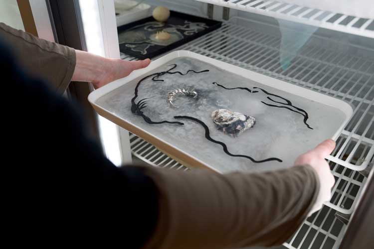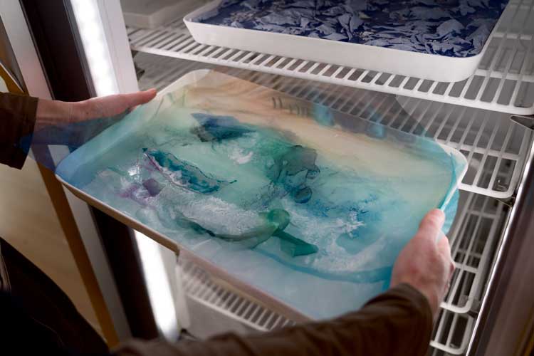Laura Lima, Imagens Congeladas [Frozen Images], 1993/2026. Freezer, plastic trays, ice, various materials. Installation view, Laura Lima: The Drawing Drawing, Institute of Contemporary Arts, London. Photo: Anne Tetzlaff.