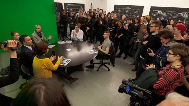LML: I’m definitely taking a page out of the broadcast television handbook. I used a TV news studio on a few occasions for projects in Sweden and Houston, Texas, where I worked with communications school students and their teachers; and have learned how to compose scripts with live editing cues. Television scripts are typically printed on light blue paper, a convention I’ve adopted, and the scripts from Absolute Event were left out on the “control room” table along with all the video and audio channel mixers – so, yes, all the technical equipment for the live-broadcast television process became part of the installation at the Paula Cooper Gallery after the performance that I edited live, while cuing the actor who played the political strategist as well as the camera people.