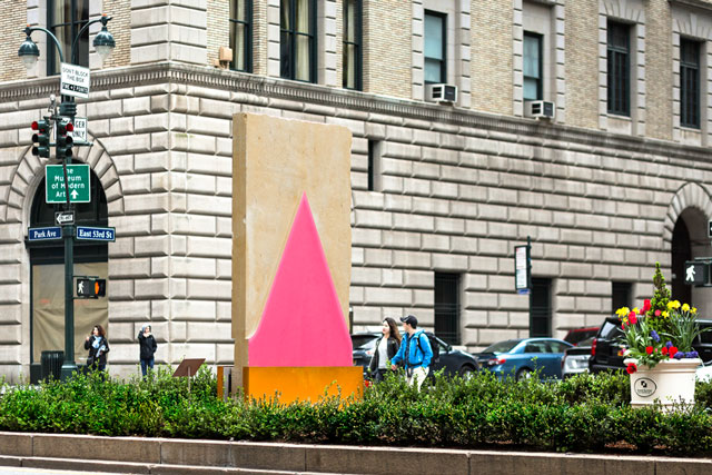 LL: This is the fourth time I’ve made such paintings. A Spanish collector with an important collection saw some small models of the stones and liked them. He asked me what I planned to do with them. I said I wanted to make them large and bring them outdoors. So he said: “Bring them to my garden.” That was three years ago. After that, his son also commissioned some stones for his place just north of Paris. Then I did an installation on Shelter Island on Long Island for a private collection in 2016, and now, this one on Park Avenue.