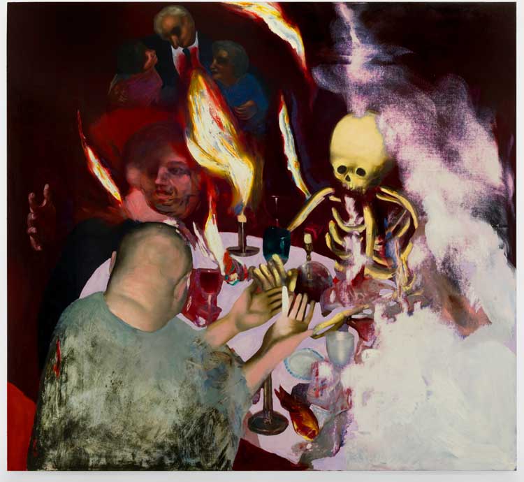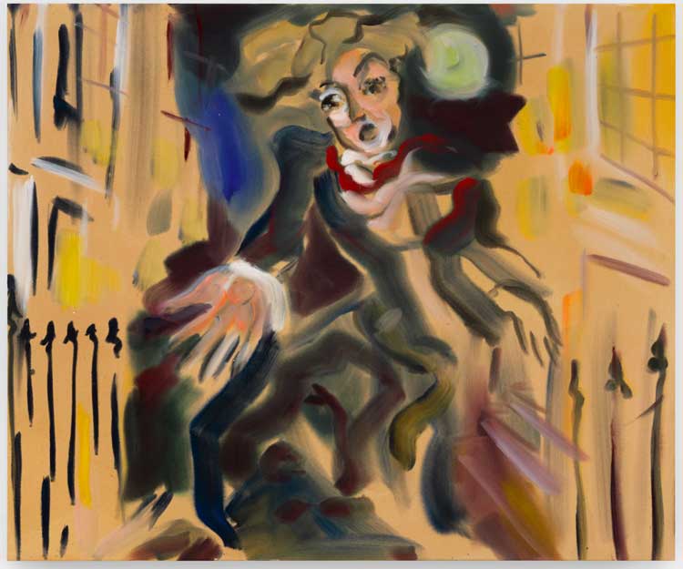 Other works seem to be included because of their affinity to Wilde and his story, rather than direct interpretations of it. Paul Noble’s drawing I (2015), although not created with Wilde in mind, uses similar surrealist imagery, including an open hand instead of a doorknob, an eye staring through the peephole of the door and a pendulum clock (Arthur Savile attempts to murder the Dean of Chichester with an explosive clock). Elizabeth Peyton’s beautiful painting Oscar and Bosie (1998) appears to be included simply for being a depiction of Wilde with his lover, while paintings by Somaya Critchlow and Gillian Carnegie (positioned on the landing and the stairwell of the gallery, respectively) offer quietly intense interior reflections that feel slightly menacing. Carnegie’s painting, in particular, which shows a view of a staircase with a black cat sitting on one of the steps, is quite unsettling, especially as it is hung beside another painting of a cat with its entrails spilling out over the bloody floor.