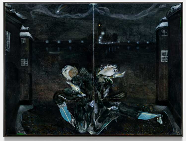 Another work that explores the darker side of the story is Guglielmo Castelli’s The Expectation of Guilt (2025), a moody painting in blacks and greys that mirror-images two figures seeming to be different sides of the same coin. They lean away from each other in strange and contorted positions (writhing in guilt?) against the backdrop of city buildings across a dark and murky river. Critchlow’s painting also brings up the theme of the double image – a naked woman looking at her reflection in a mirror – which speaks to the idea of the true self exposed from beneath the veneer of pretence in Wilde’s story.