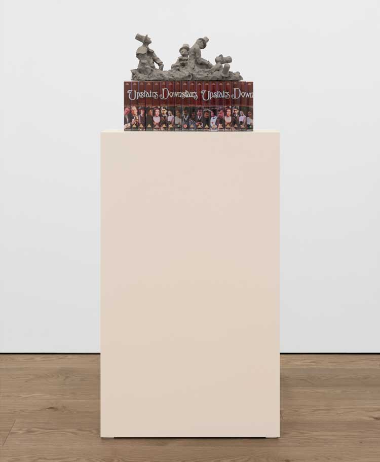 Nicole Wermers, A Gay Crime, 2025. Reinforced air dry clay, VHS tapes and covers, overall 41 x 54 x 23 cm (16 ⅛ x 21 ¼ x 9 in), clay sculpture: 20 x 48 x 23 cm (7 ⅞ x 18 ⅞ x 9 in), VHS tapes: 21 x 54 x 12 cm (8 ¼ x 21 ¼ x 4 ¾ in). © Nicole Wermers. Courtesy the Artist and Sadie Coles HQ, London. Photo: Katie Morrison.