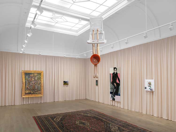 For this exhibition, the gallery space is transformed into an intimate, homely interior that brings to mind the settings for salons and society gatherings, with pale-pink curtains lining the walls and various ornate rugs underfoot. Paintings of varying sizes hang delicately against the curtain backdrop. But what makes this exhibition interesting and exciting is how it also brings in artists who disrupt the space, who shatter the perception of a clean and tidy, serious and well-presented interior, and by extension, person. This is seen most evidently in Urs Fischer’s sculpture 4 1/2 1AP (2014). A woman’s naked pink body reclines on what could be described as a chaise lounge made of clay. The brown clay is smeared across her stomach and legs, chunks strewn on the carpet beneath, muddying it. While Wilde’s upper-class characters try to adhere to a presentability that comes with a certain level of social standing, Fischer’s sculpture, in the context of this exhibition, shatters this perception, revealing the monstrous underside that Wilde himself alludes to.