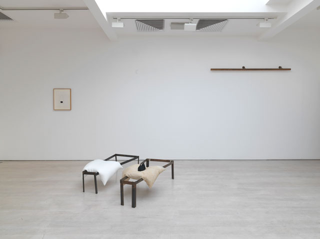 Step forms the centrepiece of the show at Annely Juda, and around it other ambivalent conversations between objects unfold. Another piece, titled At Will and The Other (1989), is composed of two metal frames, two feather pillows and a bag of black beans. The objects sit uncomfortably together, their relationship even more incongruous than that of Step. The dried black beans reappear in Untitled (1990) but, despite Nogueira’s Brazilian heritage, we are told that they are not an extension of this, nor of Brazilian art. Neither does her work reflect London’s art scene at the time – instead, Nogueira’s sculptures and installations manage to circumvent any cultural classification.