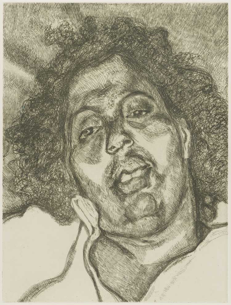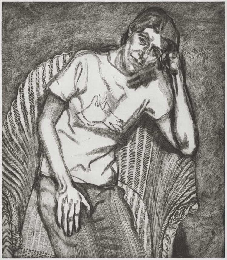Lucian Freud, Bella in her Pluto T-Shirt (etching), 1995 © The Lucian Freud Archive. All Rights Reserved [2026] / Bridgeman Images. Collection: National Portrait Gallery.