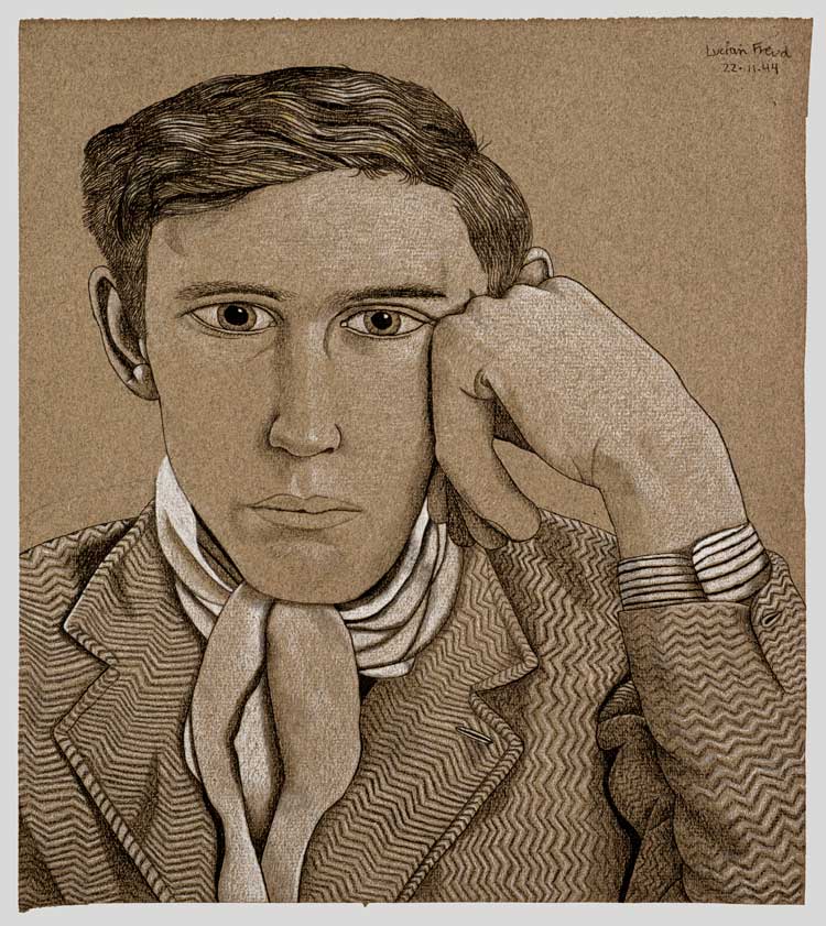 There is a jaunty portrait of Cedric Morris (1940), with pipe and cravat, painted when Freud was just 18. Morris was Freud’s tutor at East Anglia School of Painting and Drawing (1939-42). In 1939, Freud and his friends David Kentish and Stephen Spender spent three months in Snowdonia. Freud and Spender’s joint enterprise, Freud-Schuster, resulted in a number of drawings shown here. In the early 40s, Freud attended Goldsmiths College in London for a period but resisted the formality of life classes and preferred to draw sitters he knew well in familiar poses. Drawing remained important to him and he explained: “I would have thought I did 200 drawings to every painting in those early days. I very much prided myself on my drawing. My work was in a sense very linear.”