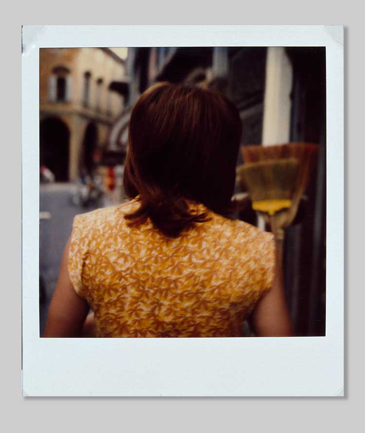 If the square format suggests totality, this only highlights the image’s omissions that render it a fragment, just as the centrality of each bust offsets its wrong-way-roundness. Enhanced by the Polaroid’s dreamy texture, the effect is to keep the image open, and our minds actively envisioning a labyrinthine world – it will come as no surprise that Ghirri was a Borges fan. Visual convention puts us in the “mind” of the statue, but this speculative realm is cordoned off; we go on an imaginary adventure, its infinite pathways metonymised in the expansive vista in the background. A similar thing happens in Modena (1980), where we see the back of a woman’s auburn-haired head and shoulders which block our view of an already blurred Italian street. The woman’s figure is cropped beneath the shoulder blades, and there are two brooms propped against the wall, one of them incidentally the same colour as her yellow leaf-patterned dress. Are these housekeeping implements the real subject of her gaze? The mythic image of Italy – scenic streets, curvaceous women, nice clothes – is distorted. The mismatch between mental image and what we see pushes us to look independently of ideology.