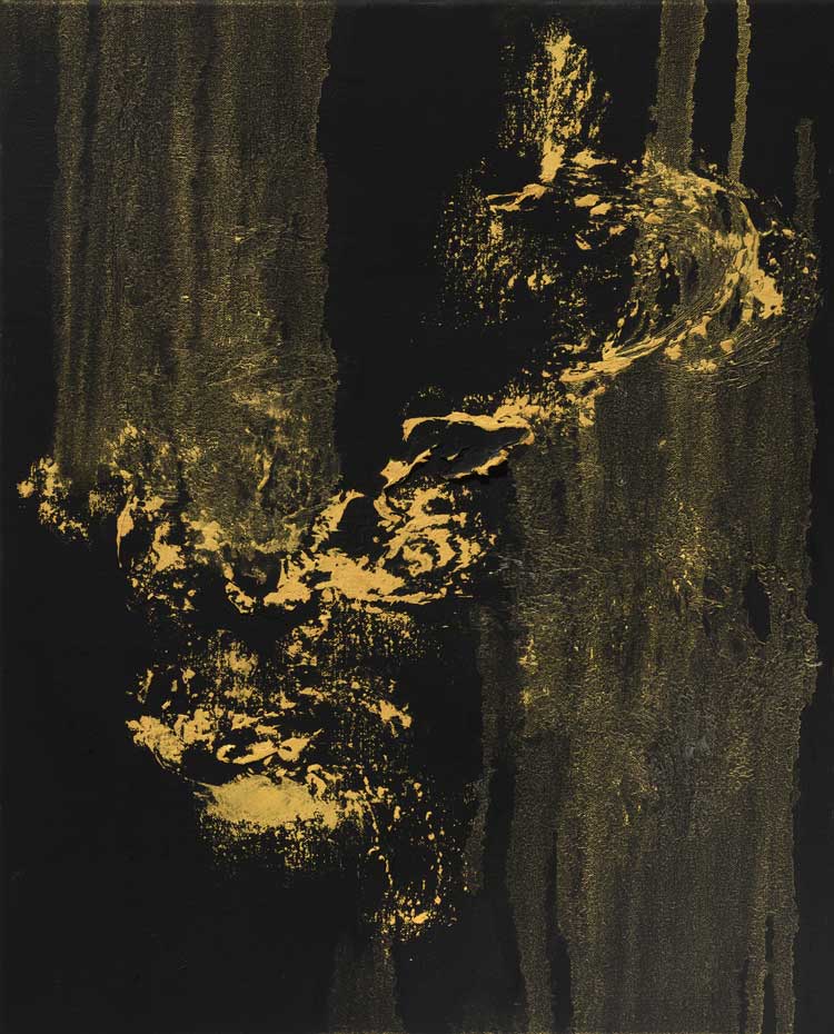 Each canvas in Hambling’s Nightingale Night series (2023-24) adopts a striking palette of gold and silver laid over a dark black ground. The metallic pigment is spattered, flicked and brushed; sometimes it is applied thickly, at other times in a more fluid manner. There is a range of scales here, from small and intimate pictures to larger compositions with a dominating presence. In each, abstract flashes and expressive daubs dance and flutter to evoke the fleeting nature of the nightingale’s nocturnal song or, as in works such as Nightingale Night VI, its swooping movements.