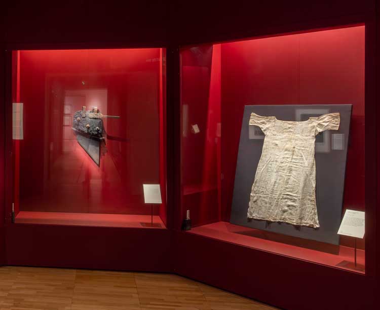 Left: The guillotine. Right: The white petticoat Marie Antoinette wore to the execution. Installation view, Marie Antoinette Style. © Victoria and Albert Museum, London.