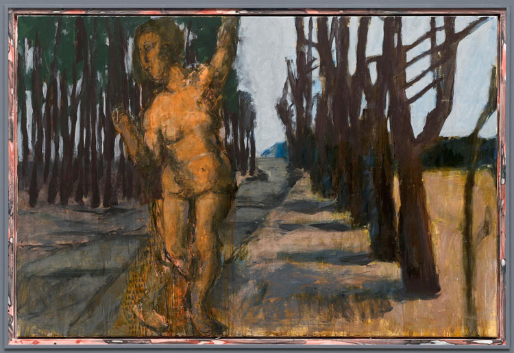 The same lake appears in Aktaion, as well as several of the exhibition’s smaller works, often (but not always) depicted as an unyielding rectangle of white. The classical Arcadia, like the region in the Peloponnese of the same name, was hilly and golden-hued. Lüpertz’s is palely lit and largely flat. One painting, Märkische Allee III (2017), features a road curving into the distance with the merest hint of a bump. Lüpertz’s landscapes are based on those that surround his studio in the March of Brandenburg, into which he brings characters classical and biblical, Arcadian and Edenic. An Eva (Märkisch) (2017) pulls the apple almost to her mouth, while a nude Nymphe Märkisch (2020) strokes her hair.