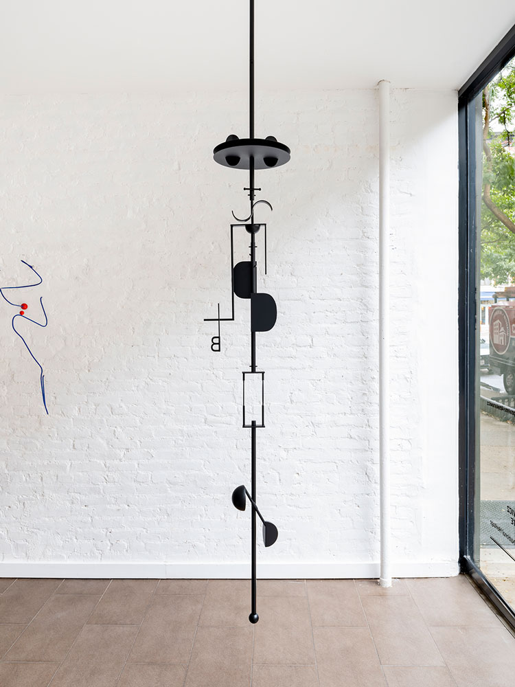Left and right: Marlena Kudlicka, Black Discrete 00 and Black Discrete 01, 2025. Powder coated steel, each 90 3/5 × 11 4/5 × 11 4/5 in (230 × 30 × 30 cm). Installation view, Nguyen Wahed Gallery, New York, 2025. Photo courtesy Nguyen Wahed Gallery.