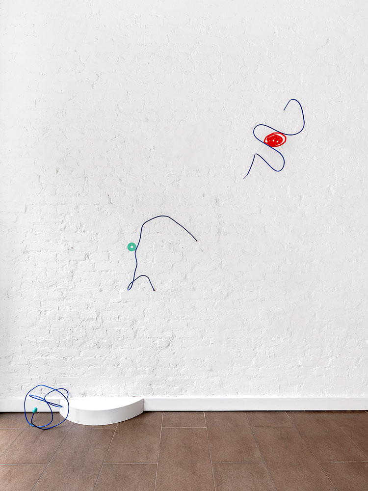 On entering, the door is flanked by Kudlicka’s sculptures hanging from the ceiling; virtually identical matte black powder-coated steel chains of symbols dropping without hitting the floor. They create an almost decorative frame for Kurant’s rotating digital rock on a monitor on the far wall – a rock spinning in a frame of words. There is a snap of colour to the right, to the left and pierced into the gallery’s walls, extending Barlik’s long practice that engages architecture and responds to space. Wounding the wall, Barlik’s work is not affixed seamlessly: there is an oozing, a mucus-coloured seeping, perhaps from a glue or fixative. This messiness belies a surprise considering the otherwise formal playful primary-coloured balls strung on twisting gravity-defying cables, that look like deconstructed abaci. Abstracted geometries extracted from public spaces is a feature of Barlik’s work, in general – skate parks with their planes and slopes, a recent body of work, reminds me of her varied uses of geometries.
