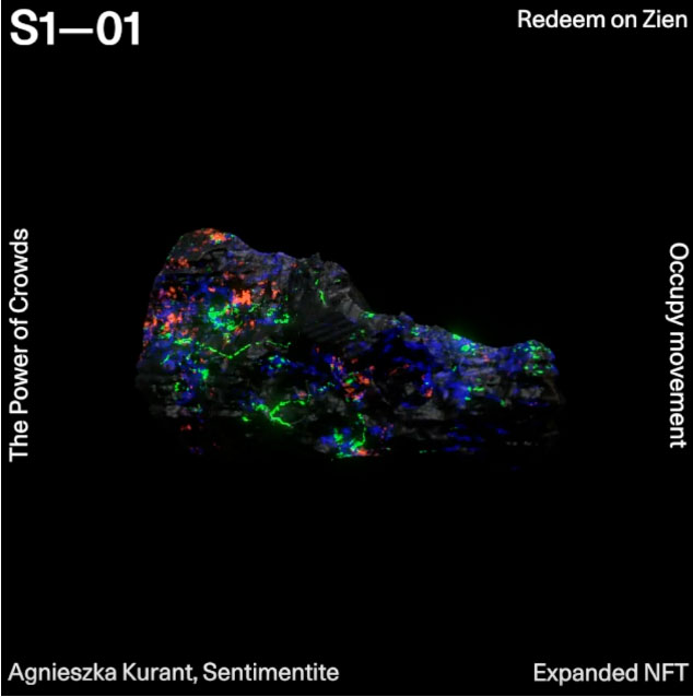 The show’s purview zooms in and out. Kurant’s digital work at the back of the room spins locations and people – participants in the global Occupy movement – into a shape that looks like a rock. In other spaces, museums perhaps, I understand there is an object, a sculpture, owned by someone, a collector. But for us here it is a shape, a digital model framed with the following words: “S1-01 – Redeem in Zien – Occupy Movement – Expanded NFT – Agnieszka Kurant, Sentimentite – The Power of Crowds”. What is Zien – does it mean to see? Does she ask us to look? Who is this crowd? What power is leveraged, and to what end?