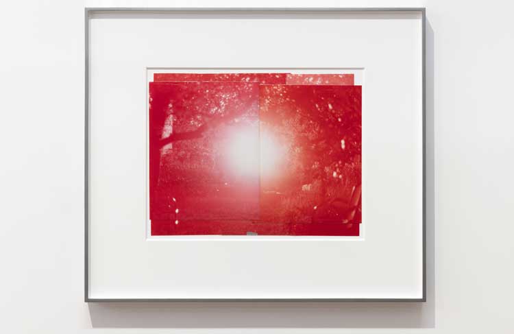 You enter Nat Faulkner’s exhibition at Camden Art Centre in London through a space filled with an orange light, glowing warmly even on the rainiest of days. Aperture functions like a giant, performing camera. A light-sensitive iodine solution filters the light from outside through the Victorian skylights, and, on our visit, it is raining, resulting in hundreds of tiny droplets sitting on the orange surface like perfect little bubbles. Faulkner likens the darkroom in his studio to a collaborator, influencing the outcome of a set-up that is directed by the artist, but never fully controlled. We are able to see that idea unfolding, here, the darkroom replaced by Camden Art Centre’s vaulted, glass roof.