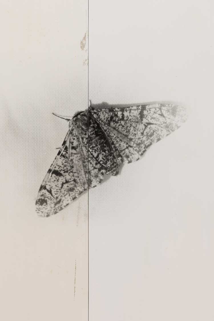 Nat Faulkner, Untitled (Biston betularia), 2026. Silver gelatin print on plywood panel, aluminium tape, white paint. Installation view, Nat Faulkner: Strong water, Camden Art Centre, London. Courtesy of the artist and Brunette Coleman. Photo: Rob Harris.