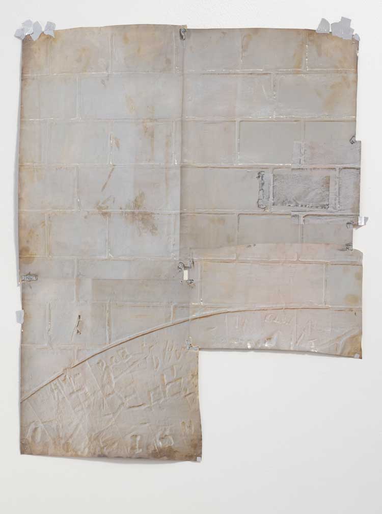 The title Strong Water comes from aqua fortis, the Latin name for nitric acid, used in the photographic process of printing with wet plates and liquids, and references the artist’s fascination with alchemy and transformation. A small grey moth seems to fly into a white canvas, searching for the light, like an alter ego of the artist himself. A series of frottage sculptures lines the walls, made by rubbing the walls of the studio on to thin sheets of copper. Electroplated with silver from the waste products of NHS X-ray labs, it suggests the artist’s presence in the abstract. Faulkner is interested in visualising the ideas of photography – black and white, positive and negative, light and dark, exposure and concealment. The process becomes the image, or in some cases, the object.