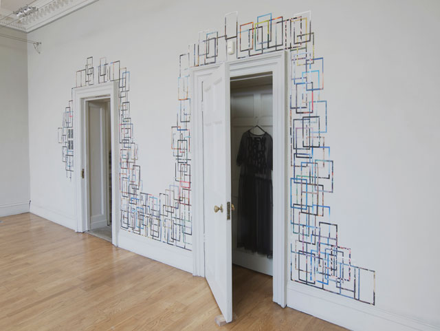 Taking advantage of a bizarre element of the building’s original (lawyer’s chambers) architecture – this room features a door that backs on to another door - Hirst has added a further element to the work by tucking into that curious cupboard space a black, almost transparent, mesh dress, into which she has pinned black letters that spell out the work’s title. There are multiple enchantments here: in the fact that the letters would be visible only if worn; the allure of the dress’s transparency (which would render the wearer almost naked); the fact that the wearer herself wouldn’t see these words as they are attached to the back panel; and that the pins would then impale the wearer – from behind - through the heart. We are like those live specimens, being prepared for examination - our own reactions and reverberations revealed to us with startling clarity by Hirtst’s razor-sharp insight. As critic David Lillington has said: “Hirst understands metaphors. She can summon and control them. This is a rare gift … she suggests a number of possible metaphors, but fulfils none of them. At the same time she ensures that they are coherent one with another. This sets up a kind of magnetic field of associations in which (the viewer feels) the imagination is held, as if suspended, or floating. And in this way, the work’s subject becomes not just the connections, but the very idea of connection itself.”