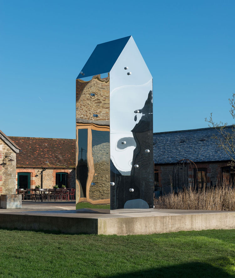 For this show, Hauser & Wirth commissioned a new work, another tower, that gleams in the entrance courtyard, its gently bulging stainless-steel planes turning the honey-coloured stone of the surrounding farm buildings into a comical parody of themselves, like in a circus House of Mirrors, as you walk around it. Cannot Enter Cannot Exit (2020) is pimpled with ceramic “snow bolts”, while its inhumanly small apertures and dimensions repel any human visitor (though it would be interesting to see if any Somerset creatures take up residence there during the show). At just over five metres high, it was designed to mimic the height of Michelangelo’s David. Dotted around the courtyard are several iterations of another work: Bale (2018). These white monuments to agricultural production have been sculpted in steel and cloaked in white varnish.