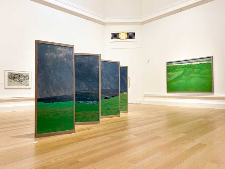 Frances Walker RSA, Atlantic Watch, 1995. Oil on plywood panel with screenprint, eight panel screen, 194 x 648 cm. RSA Collection.