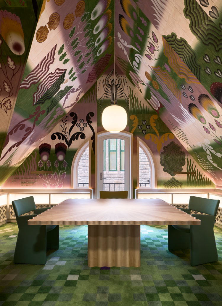 The duo have thoughtfully preserved the scale and decorative details of the original art deco building by the Norwegian architect Karl Norum, whose buildings are dotted all over Trondheim. Thus, the crisp white arches and decorated pillars of its lofty entrance hall have stayed, for instance, but there are added contemporary enrichments, such as a cosy reading room in the roof – all soft, green sofas, bespoke carpets and walls painted by the Dutch artist duo FreelingWaters with scenes of local flora and fauna in soft pinks and forest greens. Even its basement is a standout space: metal cabinetry and wall panels are interspersed with glowing alcoves featuring pale, timber lockers and cloakrooms, while its unisex bathroom walls are clad with rippling, reflective tiles more reminiscent of a Milanese nightclub than a small city art gallery. It is no surprise to learn this basement, the obvious location for film and audiovisual work, has been designed to double up as a bar and DJ space for events and openings. The uniting element for all these floors is Mahdavi’s eye-popping, mango-coloured curving steel staircase.