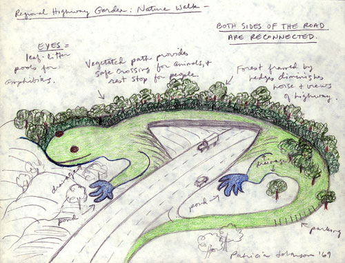 As Johanson’s works expanded, the affinity of her philosophy with nature also grew, primarily through her remarkable drawings and studies of plant life. The British landscape architect Sir Geoffrey Jellicoe (1900-96) was an interesting predecessor to Johanson. Initially, he was strongly influenced by the Italian Renaissance gardens, but he emerged as a modernist in the mid-l930s. Postwar, he was engaged on public works, new town parks and lakes, using water as an adjunct wherever possible. Like Johanson, he was influenced by the American philosopher John Dewey. Jellicoe’s public works came closest to hers with the Peak District National Park,1,2 where he designed a flow pattern to accommodate major and continuing site-excavated spoil. In other words, there was to be no closure, by its very nature. In concept, Jellicoe’s famous symbolic approach via a winding path to the Kennedy Memorial at Runnymede, England3 is not unlike Johanson’s allegorical pathway for the pioneer settlers at Salt Lake City, the Sugar House Pedestrian Crossing, a subterranean access way. Yet Jellicoe’s appraisal of nature, however profound, remained that of the committed humanist. Johanson herself moved beyond, within nature, ever more creatively, as evidenced by her prolific and highly coloured drawings. Today it would not be peremptory to suggest that Johanson can be considered as the logical 21st-century successor to Jellicoe.