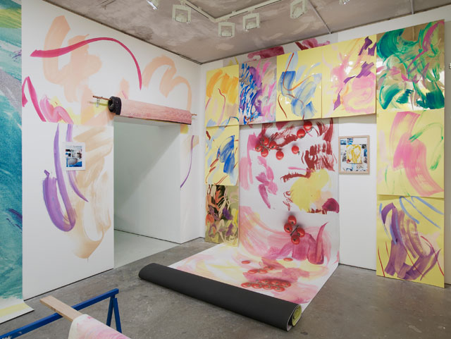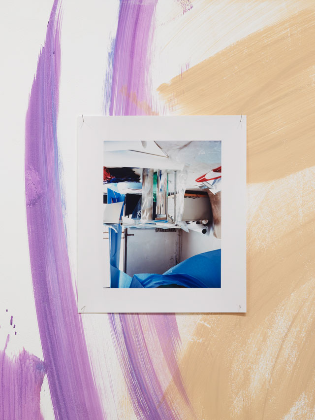 The exhibition feels quite domestic; smaller framed photographs hang on walls of thick brush strokes repeating like a wallpaper, and carpet rolls become surreal pieces of furniture. “It’s like an extract of an interior from somebody’s house,” says Franck. “Usually, I enlarge the photographs a lot more, so the objects in the photographs become almost life-sized, but for this show I decided to make them smaller because I like the way you receive the bigger things, and then have to move closer to look at these smaller images, creating a different physical engagement of the viewer.”