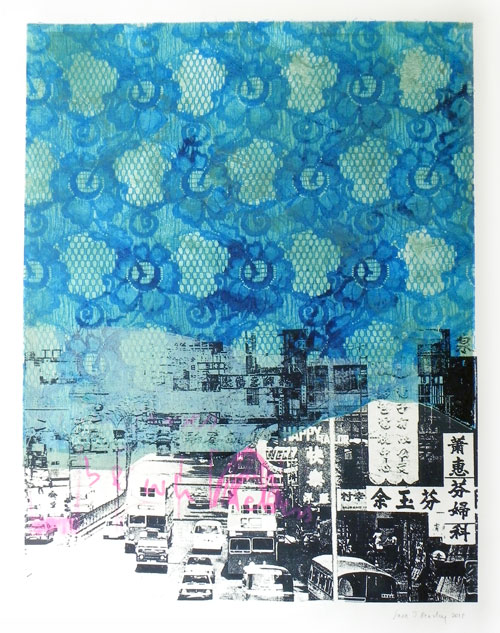 Sara Beazley has worked in London, Hong Kong, New York and Paris and uses printmaking techniques and textiles in layering methods to explore the ongoing changes to the urban environment, creating unique prints. Postcards, stamps and found images combine with the sense of place, particularly in Kowloon, where she recently had a studio.