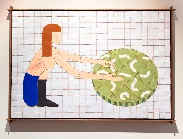 We have come to the end of the exhibition and stop in front of a second ceramic mural: a framed mosaic showing a woman in So’s trademark simple lines and matt, flat colour. The woman has a sleek haircut, an almost classical bust, and the blue pants and black boots that also appear in So’s earlier sculptures and textiles of Bellarmine men (So encountered Bellarmine vessels in the V&A. These German stoneware jugs, which were made between the 16th and 18th centuries for drinking and storing ale or wine and featuring the face of a wild-looking bearded man, were exported widely across Europe, including to England). The woman crouches down, reaching out to a green tray with white silkworms, the gesture kind and caring. “It was a bit intimidating, being asked to exhibit here and feeling that you are representing your group,” So says. “I don’t want to be a representative. And at the same time my story is not unique: I lived in different countries, I am an immigrant, it was tough sometimes. My work carries references from east and west. She points to the crouching woman. “But this work is not talking about some abstract woman in the past; it is a self-portrait. There is something of the inner child here that we all have. I also keep worms, although not for silk but for compost,” So laughs.