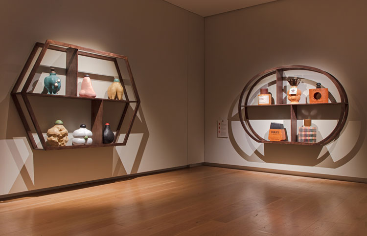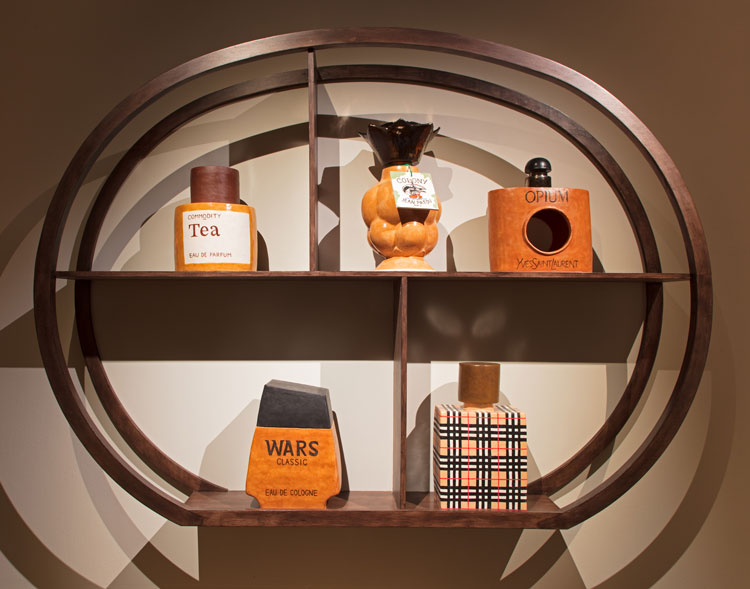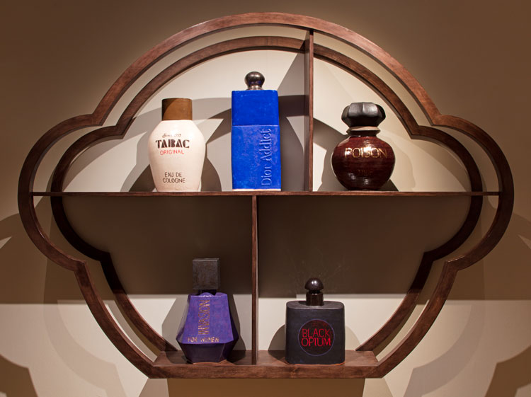 These themes become clear in the first gallery of So’s exhibition, comprising a series of oversized snuff and perfume bottles, made of ceramic. The objects are artfully displayed in four geometric, suspended “shelf units” designed by the artist and made of stained plywood. I ask So if she has designed anything like this before. “No! My sculptures are usually on plinths,” she replies, smiling, “but this space is more like a house than a white cube. Snuff bottles are domestic objects, and they would have been collected by wealthy ladies and aristocrats living in stately houses like this one. Snuff bottles are small, so the Europeans would display them together on shelves or cabinets, as collectibles. But in China, where the snuff bottles originated, they were used by the palace for imperial use only.”
