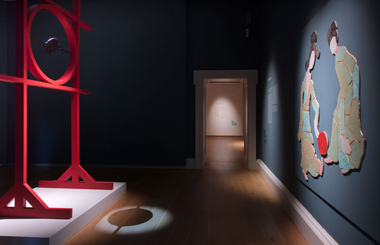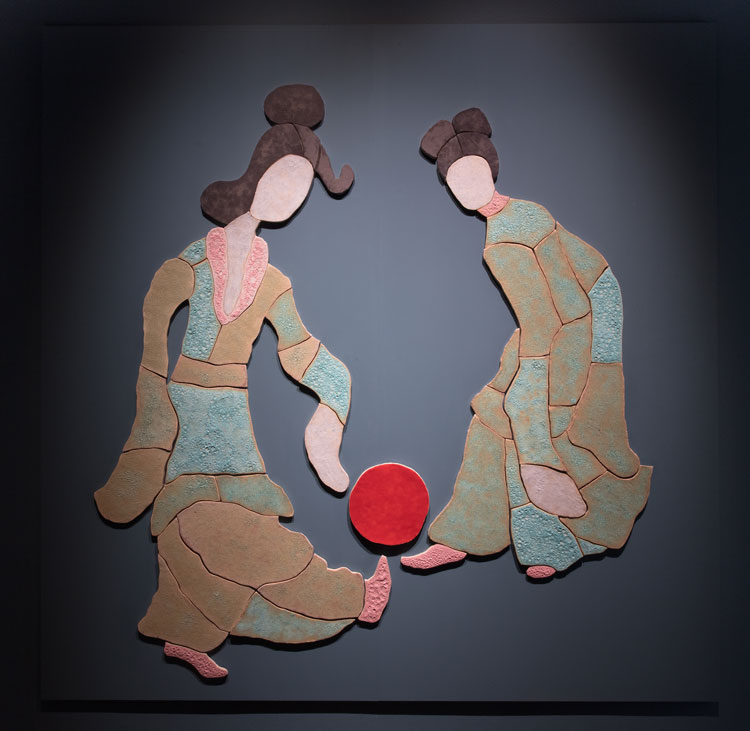 The football theme is further explored in the second gallery, where a “magic mirror”, suspended from a red steel construction based on ancient depictions of a football goal, projects an image on the opposite wall, of two women playing football. “Magic mirrors were invented in China under the Han dynasty (206BC – AD220), but I encountered them via a different route,” So explains. “The Peter Moores Foundation, which took over Compton Verney, made most of its money from football and so I went to the Fifa Museum’s website and looked through their collection. They had an ancient Chinese bronze mirror, and it showed women playing football. I loved it! Football was invented in China and women were playing it from the beginning.” On the wall is a ceramic mural of two women with traditional Chinese hairdos, kicking a bright red football between them.