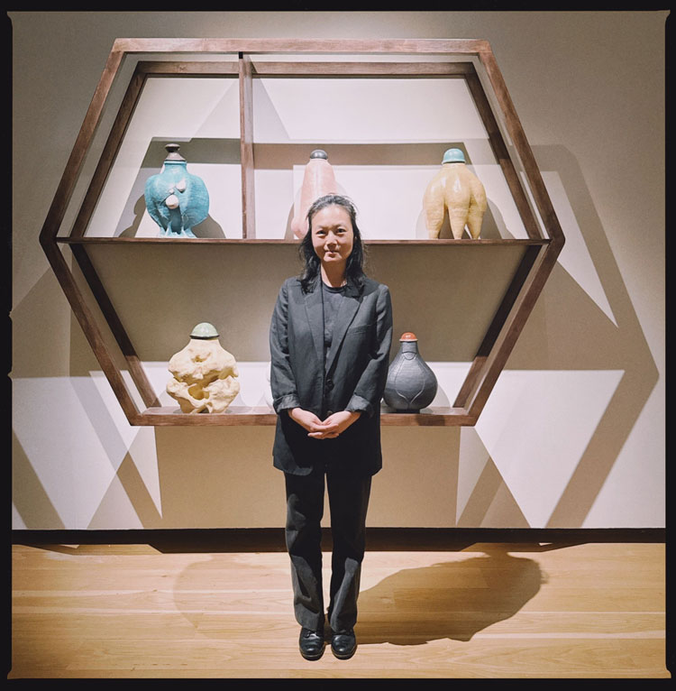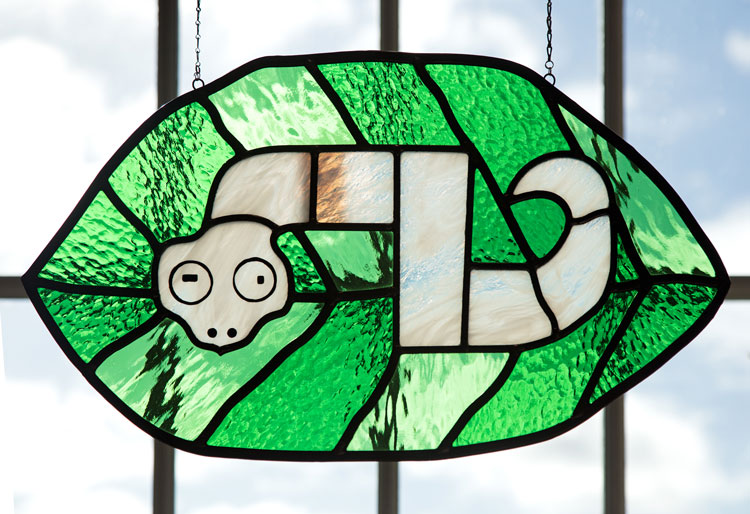 The theme of womanhood is prominent in the next room, too, although we are introduced to it via a worm. The worm appears in a pet-sized ceramic sculpture with a bronze glaze (on a plinth this time) and lying on a leaf in a stained-glass sculpture suspended in front of the window, reflecting the green grass outside. “The image of the Taotie looks abstract, but it is derived from a worm and a moth,” So explains. “Silk production was invented by a Chinese woman, the Empress. The story goes that the Empress sat under a mulberry tree, when a silk cocoon fell into her cup of tea. The heat released a thread from the cocoon, and that’s how she discovered silk. She started keeping the worms and then she invented a loom to weave.” I wander off to admire a sculpture of a turtle, the same patinated green as some of the objects in Compton Verney’s Chinese collection. “The three main inventions during the Shang Dynasty were silk production, bronze casting and writing,” So says. “I have tried to capture that by making ceramics with bronze glazes. I like to explore the differences between cultures, but also what is universal: pottery and later bronze casting developed simultaneously in different countries and cultures; people started playing games with a ball everywhere around the world at a similar time.”